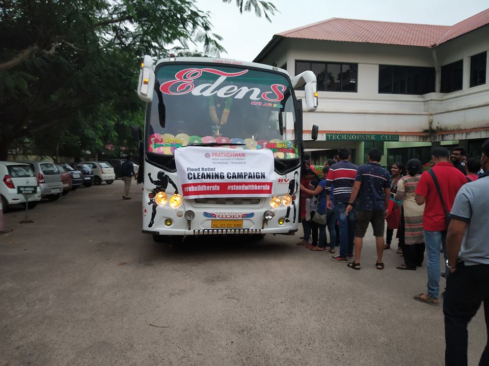 IT Employees started for Prathidhwani's Flood Relief cleaning activity II from Technopark Club.Prathidhwani Joint Secretary Joshi A K described today's cleaning plan and Smt Aswathy Satheesh (Nursing Supervisor, KIMS) flagged off the trip.The cleaning area decided is Pulikunnu and Kuttanadu.
