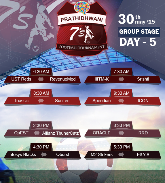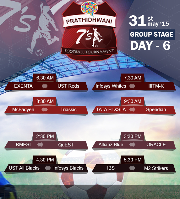 After the knockout stage the group stages had begun and completed 8 matches out of 24.The remaining 16 matches will be held this weekend at Technopark cricket ground. We invite all football lovers and Technopark employees to be part of this event and support the teams. The matches will begin from 6.30 AM -10.30 AM(4 matches) in the morning shift and 2.30PM -6.30 PM (4 matches) in the evening shift. After the group stage is completed, the top 2 teams in each group will head to the Pre-quarter stage which will be held during 6,7 June 2015. This weekend fixture is below.