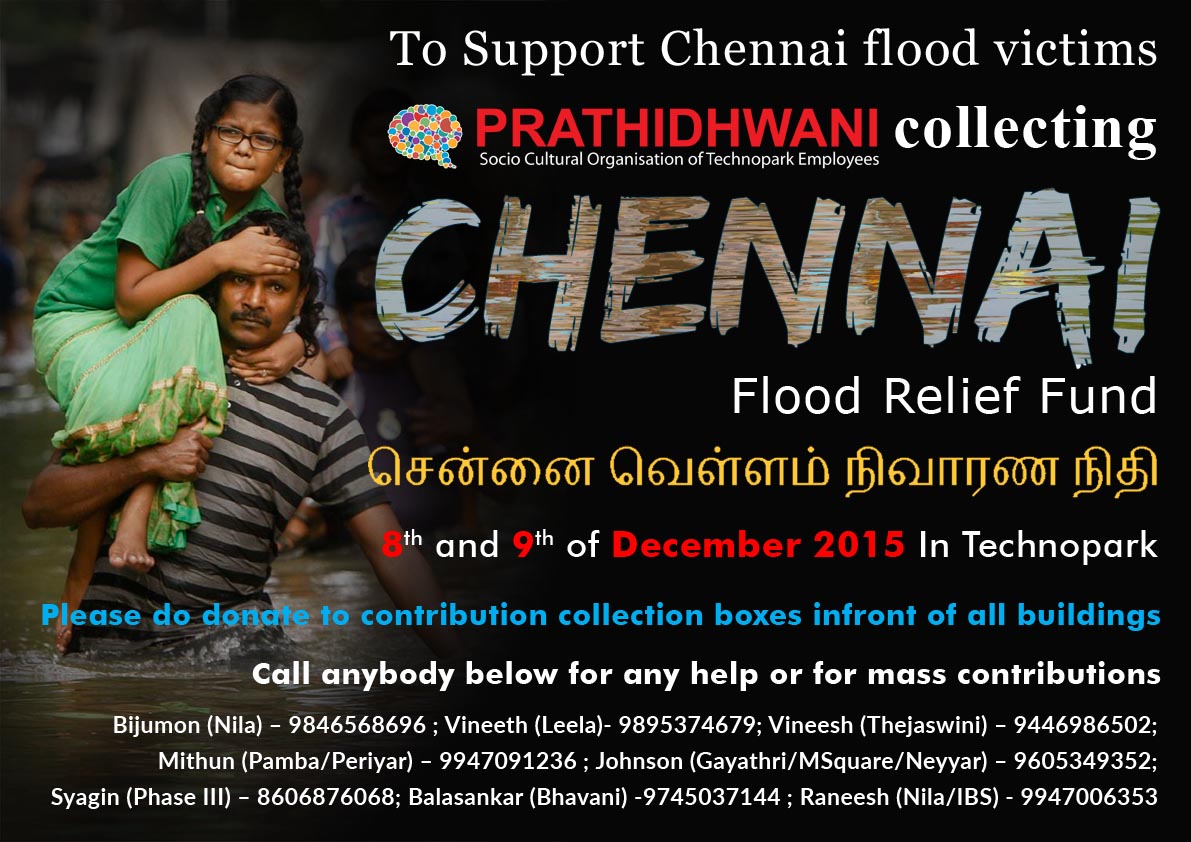 Let’s all stand by the people of Chennai during this time of hardship. Prathidhwani is organising a Chennai Flood Relief Fund on this Tuesday& Wednesday - 8th and 9th of December 2015 in Technopark. Please do donate to contribution collection boxes in front of all buildings on 8th and 9th of December. We request you to provide your support through your donations. Please encourage your colleagues and friends to do the same. We will hand over the donations to Government of Tamilnadu or genuine reputed organizations for rehabilitation of poor people. Employees can hand over their contributions to anybody listed below. Technopark Phase III ? Syagin– 8606876068/Magi -9846500087 NILA ? Bijumon – 9846568696 /Sreejith - 9895893865; Leela Inforpark ? Vineeth- 9895374679/Ajith Anirudhan – 9947806429/Bimalraj-8129455958 Amstor ? Johnson – 9605349352 Gayathri ? Prasad – 9497313802 / Suresh – 9847799222 MSquare ? Binu – 9349230505 ; Tataelxsi ( Neyyar ) ? Mukesh Raman – 9037990954 / Narayanaswami Padmanabham ? Sunilraj - 9895582628 IBS Campus ? Prasanth – 9747148318 / Raneesh – 9947006353 Thejaswini? Vineesh – 9446986502/Shibu- 9544324970/Deepak – 9846499559/ Bhavani ? Balasankar -9745037144 / Bibin - 9446084359 ; Pamba/Periyar ? Mithun – 9947091236 / Aravind - 9895026276; Quest Global ? Rajith VP - 9947787841 /Kannan – 9901822433 Chandragiri ? Rahul - 7356345265 “Prathidhwani”- Socio-Cultural Organisation of Technopark Employees www.facebook.com/Prathidhwani prathidhwani.devicedriven.com