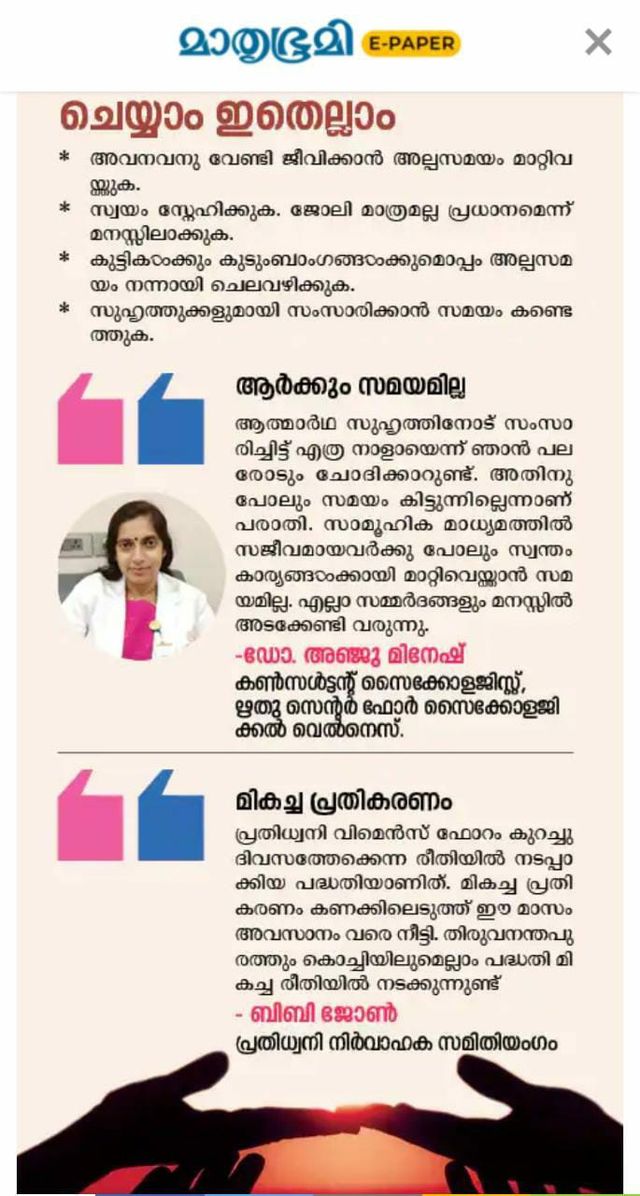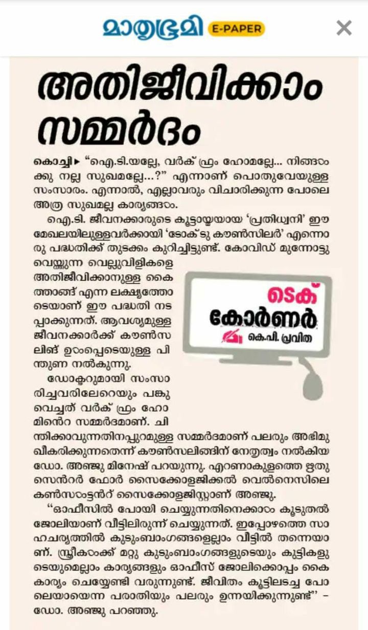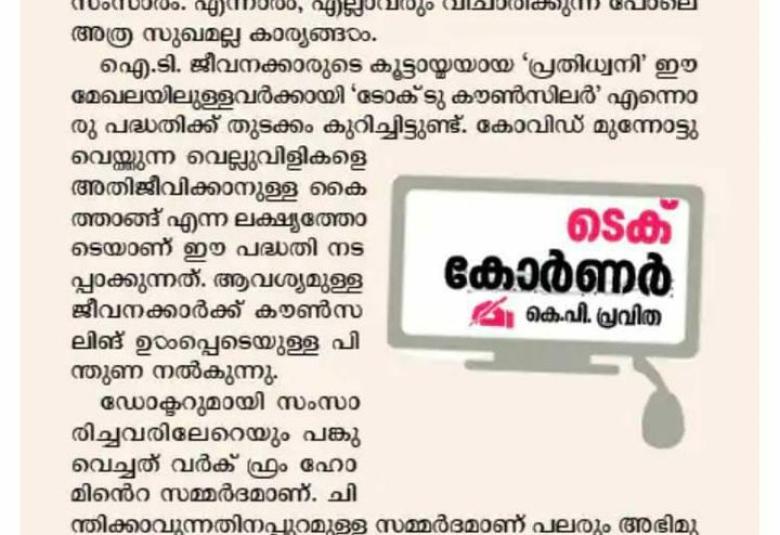 Prathidhwani's "Talk To Counsellor" program for IT Employees featured in Mathrubhumi