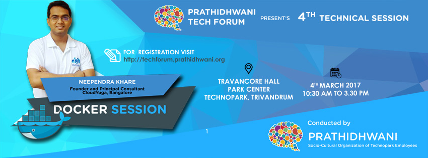 Prathidhwani has always been at the forefront to enhance and explore the cultural, technical and social values of the IT community. Latest in the offering is the one day session on Docker Container Technology. On behalf of the entire Prathidhwani team, we feel privileged to invite you to Prathidhwani's one day Docker Session - Build, Ship and Run any App, Anywhere. Instructions and prerequisite for the event. Entry to the event is via registration http://techforum.prathidhwani.org/ We look forward to meet you on March 04th in Travancore Hall, Technopark, Trivandrum. When: March 04th, Saturday, 10.30AM to 3.30 PM Where: Travancore Hall, Park center, Technopark, Trivandrum. Speaker: Neependra Khare, Founder and Principal Consultant  CloudYuga , Bangalore.