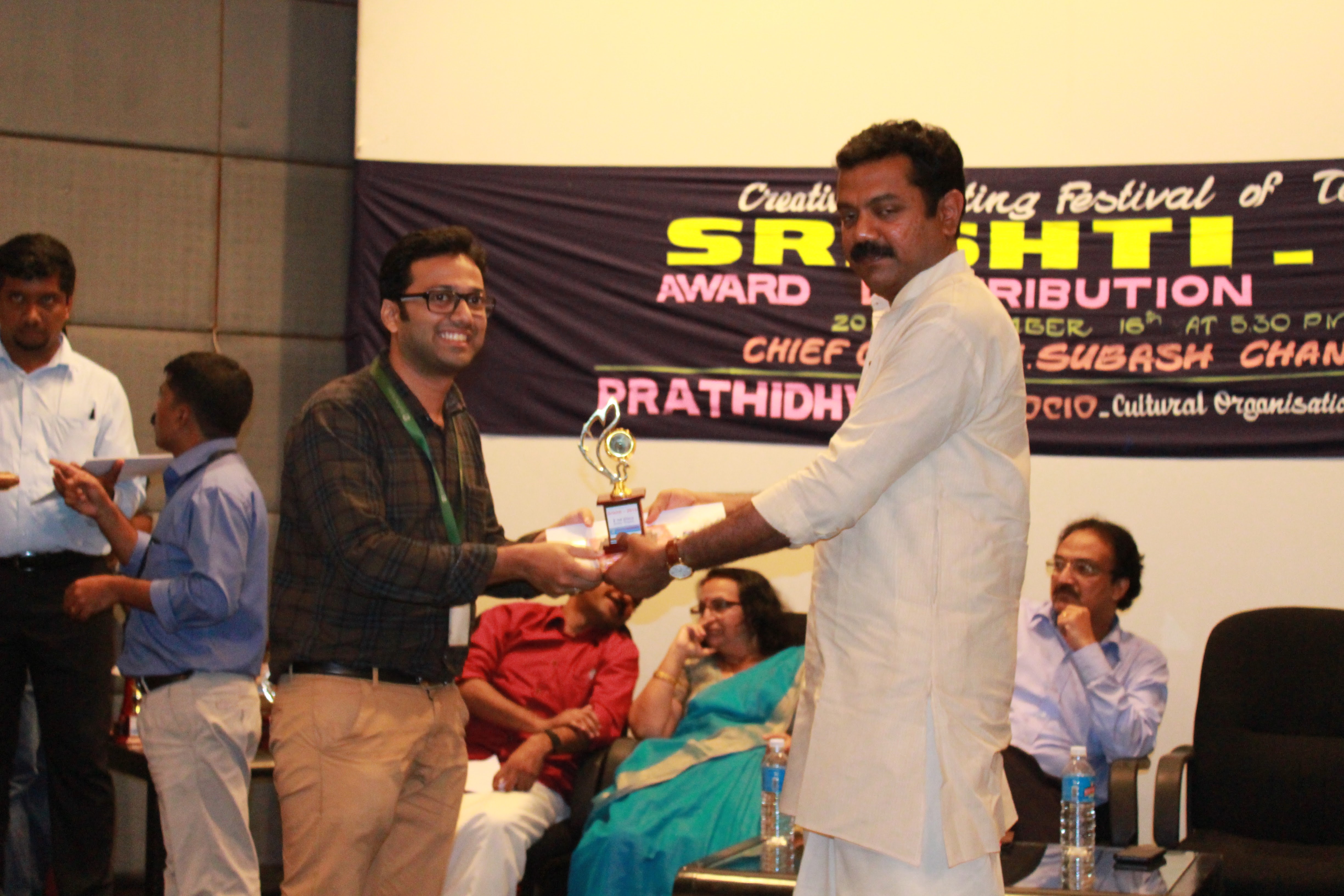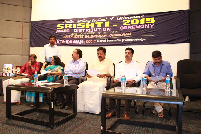 Awards were distributed by the eminent and one of the most read young writers in contemporary Malayalam literature, Sri, Subash Chandran on 16th of November 2015 at Travancore hall in Technopark. The event which spanned around 2 months, invited entries in Essay/Short Stories/Poetry in both English/Malayalam. In his inaugural speech, Sri. Subash Chandran stated that in a generation where the word, ‘Culture’ is fanciful, words are taking a new turn, where the words are coined which were once considered as contradictory. He quoted the examples of goons and ethics are now coined together to form moral policing and that bookfairs are now common place. He also voiced his concerns that in the birth place of one of the world renowned visionary, Sree Narayana Guru, where it is expected that for atleast a 1000 years his principles of unity and harmony should sustain, is now in a very nonsecular and unstable state. He also expressed that it is the youth and the writers who should be among the first to object and direct the nation to the right direction. The President of Prathidhwani, Bijumon presided over the function, whereas the jury Chair Person, Smt. Chandramathi teacher felicitated over the function. She told that the common misconception of techies outside Technopark is that they only work with their brains and not with their heart and that the events like Srishti has proven it otherwise. She also expressed her happiness on the immensity of the thoughts and impeccable awareness of the topics of the contestants who participated in Srishti. Renowned English poet and Jury member, Sri, Gopi Kottur said that it was a very difficult task to assess the entries as every entry was of extraordinary quality and specially mentioned about the craftsmanship of the authors. Sri. Vinod Vellayani, another jury member, said that poetry is not just an pastime, but a strong and wonderful visage of art. He also said that in difficult times, it is the responsibility of all artists to express his thoughts and protests in various forms of art. Sri. Suresh Kottur, Jury member of Sristhi 2015, communicated that the root to an artist is his desire to tell the society in his own voice. Technopark Business Development officer, Sri. Basanth extended all support and encouraged Prathidhwani to move forward with more initiatives like this. He also said that Technopark is fortunate to have an employee forum like Prathidhwani. Srishti 2015 Convener, Bimal Raj said the welcome speech and Prathidhwani Secretary, Rajeev expressed the vote of thanks. Special Thanks to Mr.Tom J Mangattu (Indulekha Media Network), SFS, KADA.in, Palnaar Solutions & Standout Solutions for supporting Prathidhwani for Srishti 2015.